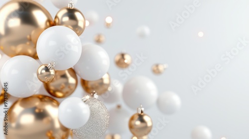Winter Wonderland, a mesmerizing 3D render showcasing elegant white and gold Christmas ornaments, featuring an empty glass snow globe against a pristine white backdrop.