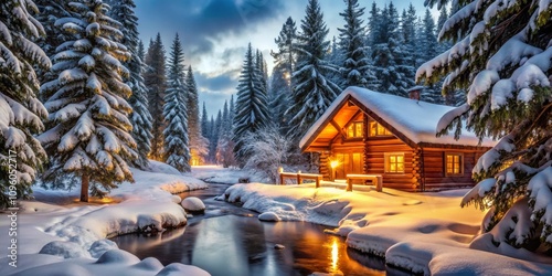 Winter Wonderland Cabin Log Cabin by Stream, Snow-Covered Pines, Twilight, Winter Scene. Winter, Cabin, Landscape