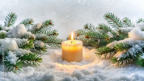 Winter Wonderland Candle Photography: Cozy Snow Scene, Evergreen Branches, Festive Lights