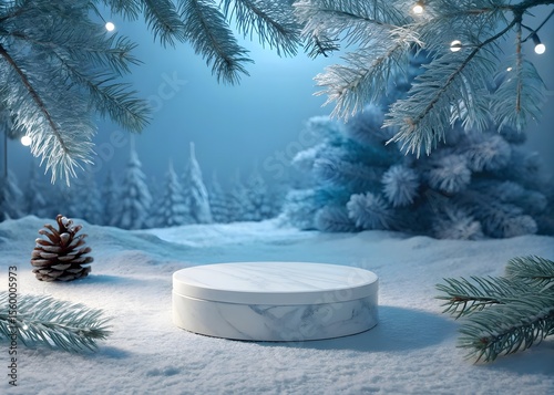 Winter wonderland display pedestal with pinecone and frosted fir branches