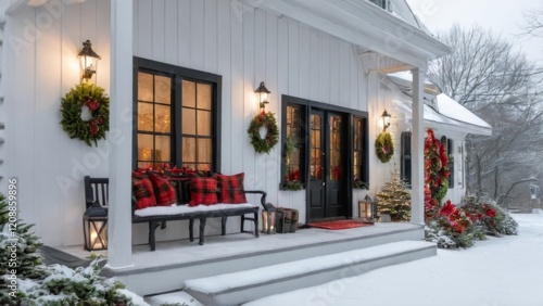 Winter Wonderland: Festive White House Decorated for Christmas with SnowCovered Porch and Peaceful Holiday Atmosphere