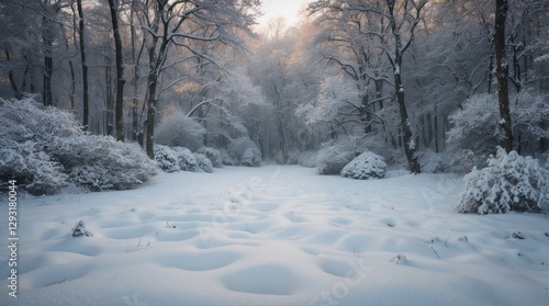 Winter Wonderland in a Snow-Covered Forest with Tranquil White Landscape and Frosty Trees Glimmering in Soft Morning Light