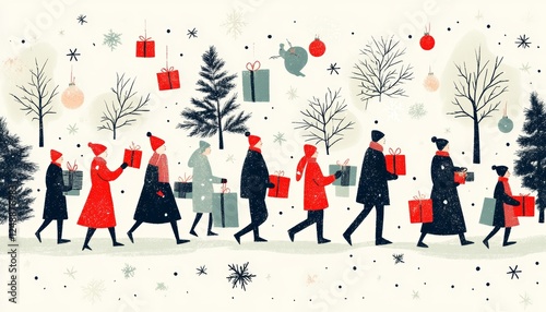 Winter Wonderland Procession Families Exchange Gifts Amidst Snowy Trees and Festive Decorations.