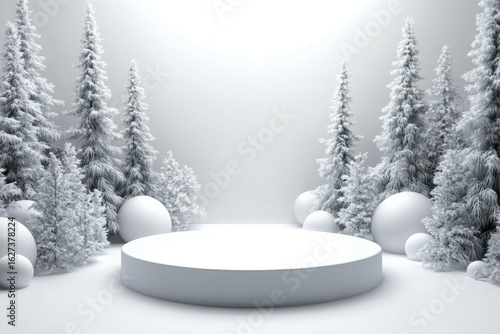 Winter Wonderland: Serene Snowy Landscape with Pine Trees and White Christmas decorations celebration, 3D minimal