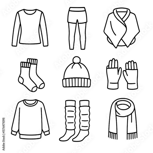 Winter Yoga Clothes Icons. Outline style icons of Winter Yoga Clothing: long-sleeve top, layered leggings, cozy yoga wrap, thick
