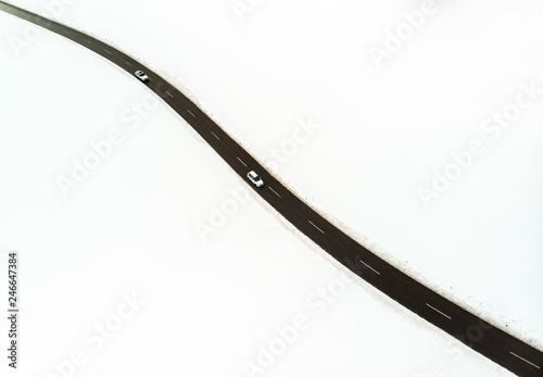 Winterlandschaft mit Straße und Hütten
