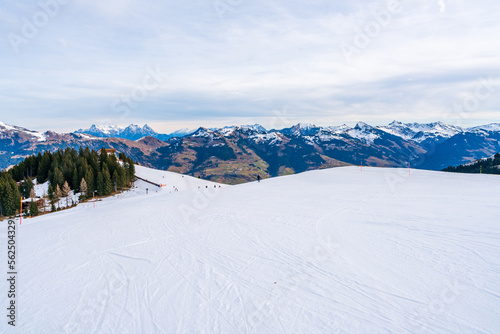 Wintry landscape on Hahnenkamm mountain in Austrian Alps in Kitzbuhel. Winter in Austria
