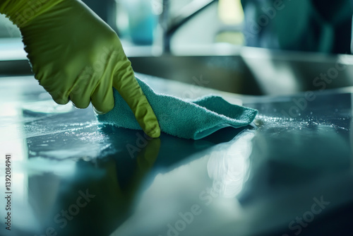 Wiping Down a Clean Kitchen Surface. A person's gloved hand wipes a surface with a cloth, cleaning and removing grime.
