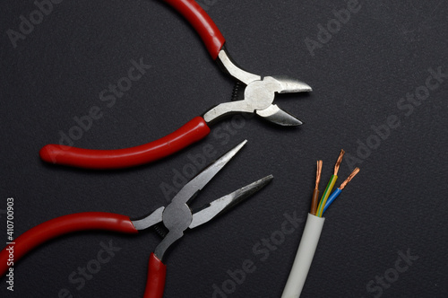 wire cutters, pliers and stripped wire lie against a dark background. close-up.