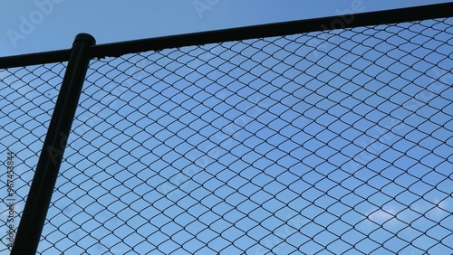 Wire net with blue sky background, used as a field fencing for safety