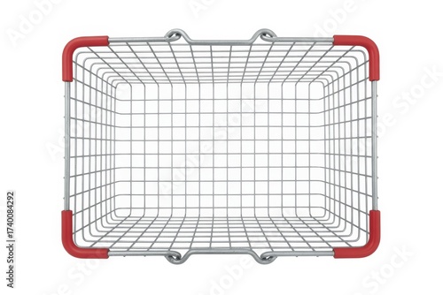 Wire shopping basket with red handles placed on a clean surface for grocery shopping