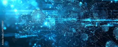 Wireframe illustration of interconnected gears and technology background