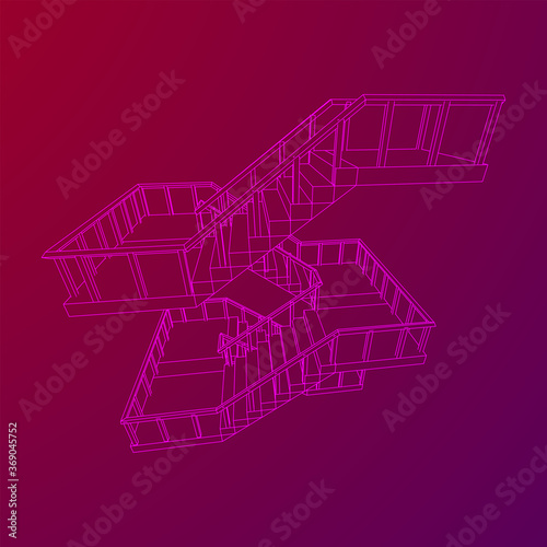 Wireframe stairs, interior staircases steps with railing. Wireframe low poly mesh vector illustration.