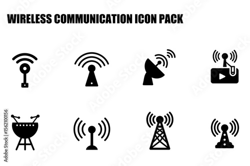 Wireless communication icons in a flat design style. Simple, vector icons depict various communication devices, including transmitters, antennas, and satellite dishes in a simple, clear presentation.
