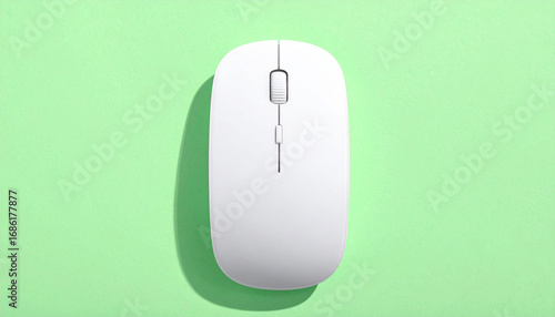 Wireless Mouse on Green Backdrop: A pristine wireless mouse, showcasing its elegant design and ergonomic form, rests on a vibrant green surface, casting a soft shadow. Perfect for tech concepts.