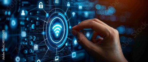 Wireless technology concept of the Internet of Things, with a hand pressing a button on a screen