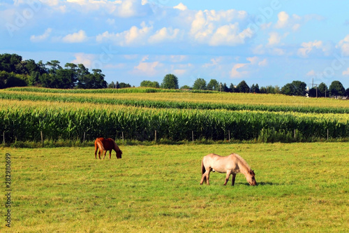Wisconsin summer rural nature background. Beautiful rural landscape with two horses grazing on a paddock in sunlight, field of corn in a background. Agriculture and farming concept. Midwest USA.