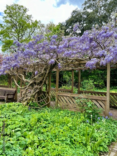 Wisteria Tree with flowers growing on top of a pergola with other flowers and fauna in the foreground. Taken in an English Garden. No people.