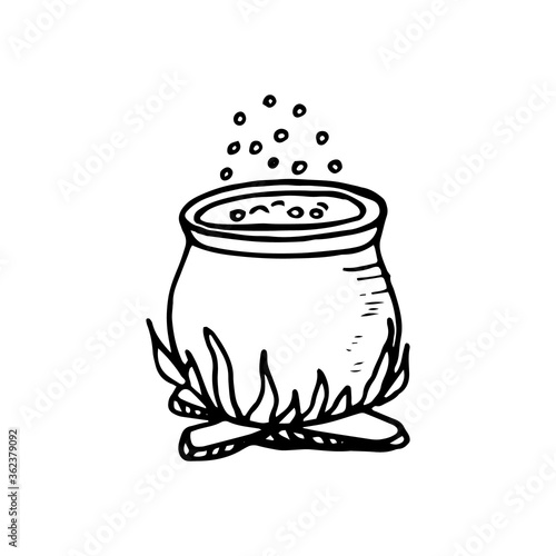 witch cauldron with boiling potion on a bonfire hand drawn in doodle style. vector, scandinavian, monochrome. single element for design card, sticker halloween decor