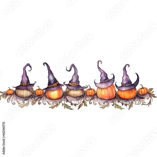Witch hat graphic border illustration, isolated on transparent background. With pumpkins