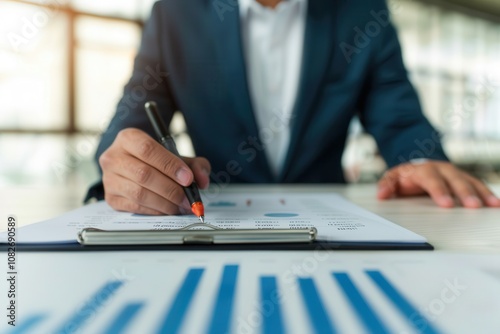 With a smile, a business professional focuses on retirement planning and financial literacy, analyzing data and taking notes, with graphs and charts clearly visible on the document.