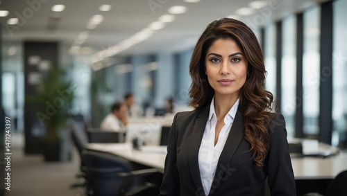 With grace and confidence, a striking Middle Eastern woman stands in a sleek office, file in hand, poised as she faces the camera directly.