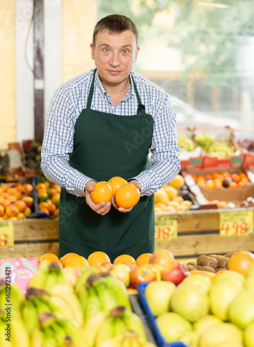 With practiced hand, man supermarket worker arrange oranges in neat pyramid by window. Male seller of vegetable department of store is replenishing showcase with oranges, puts ones on showcase