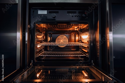 with the oven door opened, showing off its shiny interior and warm glow, created with generative ai