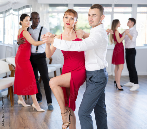 With unhurried music, guy and woman in couple spins to rhythm of rumba during lesson for novice students. Classes in mini-groups for those who want to learn dancing
