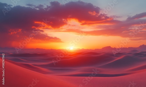 with wind-swept sand dunes and a vivid orange sunset, Generative AI