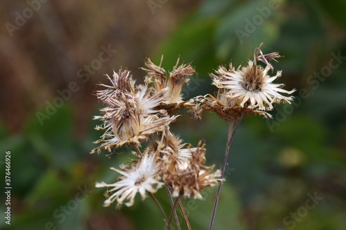 Withered and shriveled Thistle. Dead brown wildflower macro view