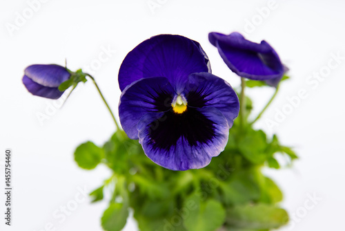 Wittrock's violet (Viola × wittrockiana), a variety of garden flower Pansy eyes or spring garden viola tricolor. Dark blue flower on a white background