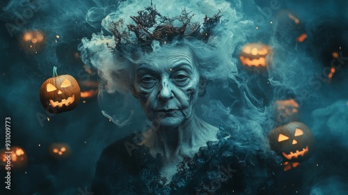 Wizard Old Woman with Crown in Halloween Scene on Smoke Background