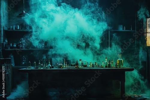 Wizard's Desk. Horror Halloween concept. Magic potions in bottles on wooden table with books and candles.