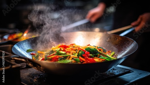 Wok vegetables stir-fry, restaurant kitchen, chef cooking