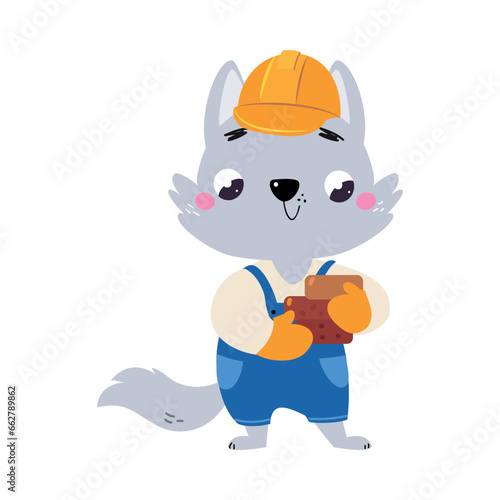 Wolf Builder Character in Hard Hat Carry Bricks Vector Illustration