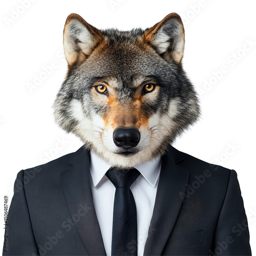Wolf dressed in a business suit standing against a Transparent background showcasing a unique blend of elegance and wildness, Wolf in Business Suit on PNG background
