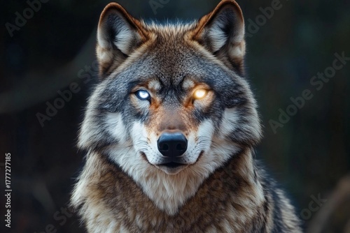 Wolf with radiant eyes reflects the power of the moon in a mystical forest setting under twilight sky