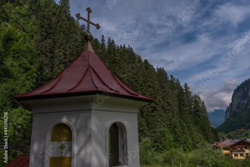 Wolfaukapelle chapel in sunny cloudy morning in Austria mountains