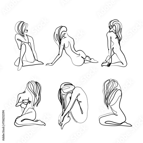 Woman abstract silhouette set, nude body, single line on white background, continuous line drawing, tattoo and logo design, isolated vector illustration.