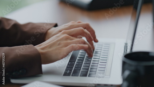 Woman accountant typing documents on laptop keyboard close up. Girl working.