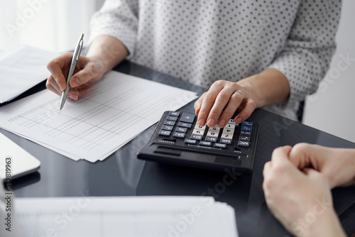 Woman accountant using a calculator and laptop computer while counting taxes for a client. Business audit and finance concepts.