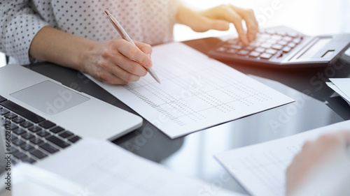 Woman accountant using a calculator and laptop computer while counting taxes for a client. Business audit concepts