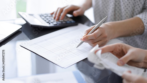 Woman accountant using a calculator and laptop computer while counting taxes with a client or colleague. Business audit team.