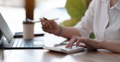 Woman accountant working in office using calculator and holding credit card, hands closeup, panoramic banner. Online shopping concept.