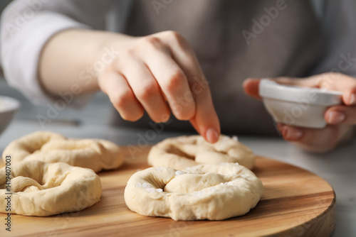 Woman adding sea salt onto uncooked pretzels at table indoors, closeup