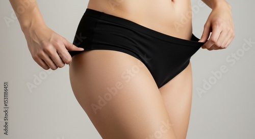 Woman Adjusting Black Underwear Closeup Studio Shot