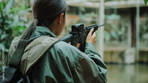 Woman aiming rifle, jungle ruins backdrop, military training