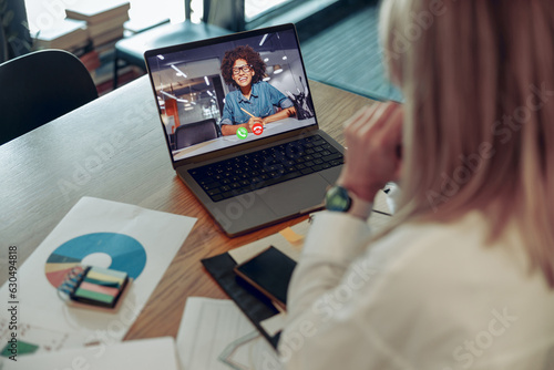 Woman analyst working with documents during video conference while sitting in modern coworking