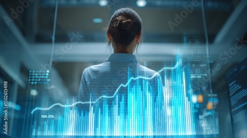 Woman analyzes data on glass display. Growth, progress, and upward trends are visualized in blue digital charts and information. Technology and analysis